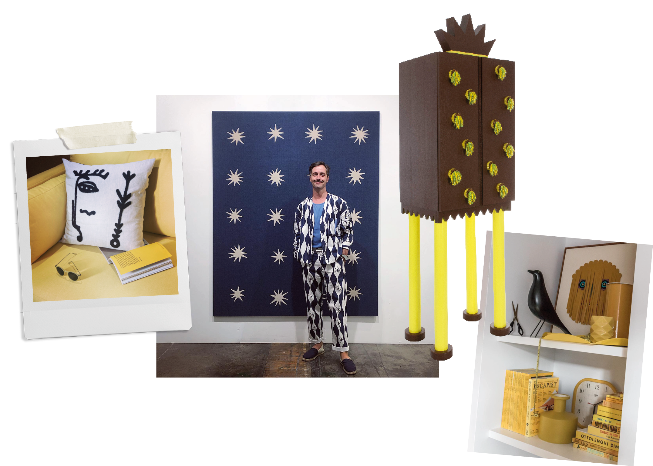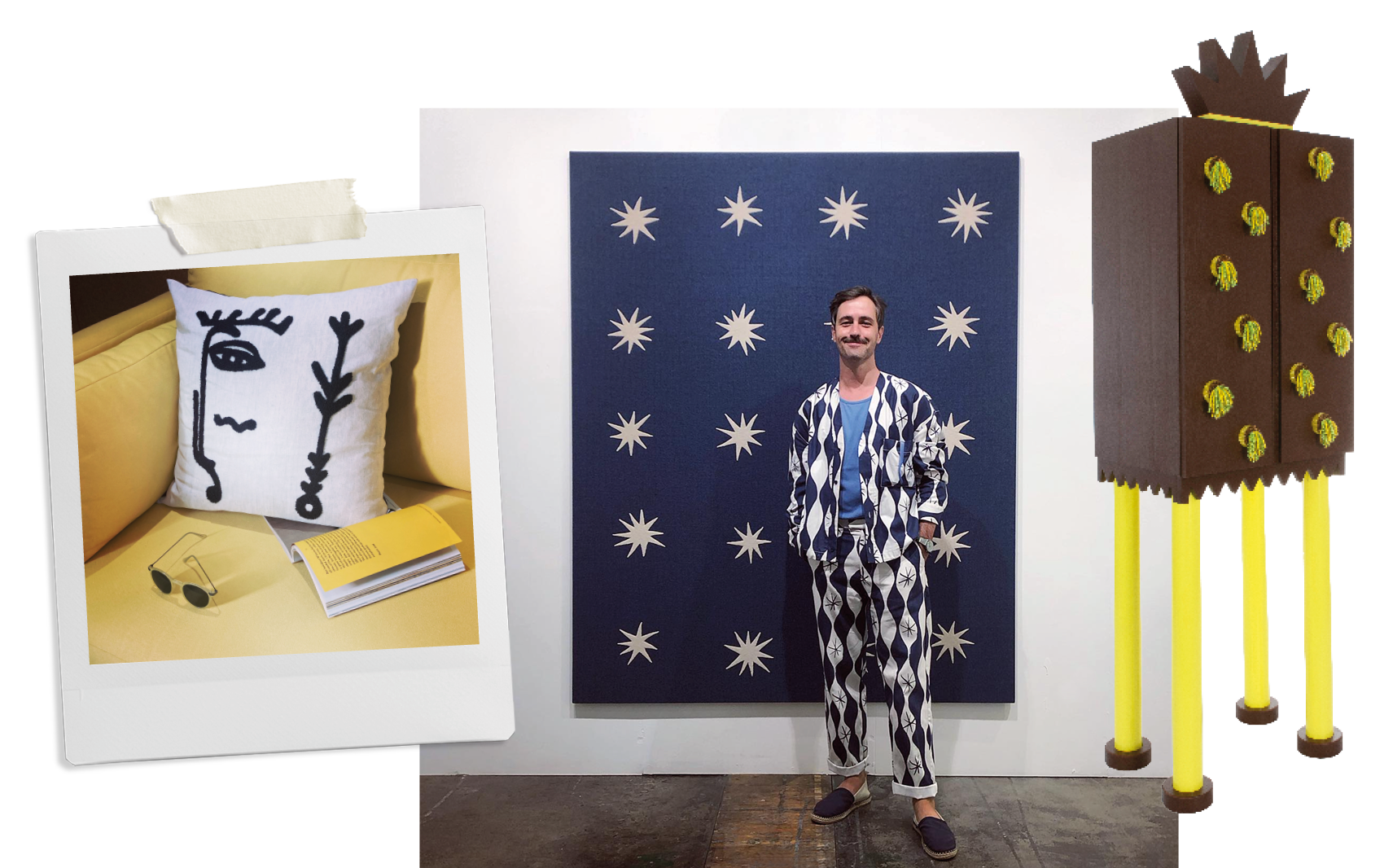Charl pictured in front of ‘Pezzo di cielo’ (2021) by Adelaide Cioni (P420 Gallery), wearing his magic (and matching) “Jacquemus by Zara” suit, alongside more playful shapes, scenes and shelves (featuring LOOKBOOK Studio, Pezula Interiors, Ananta Design Studio, Vitra and Chloe Townsend).